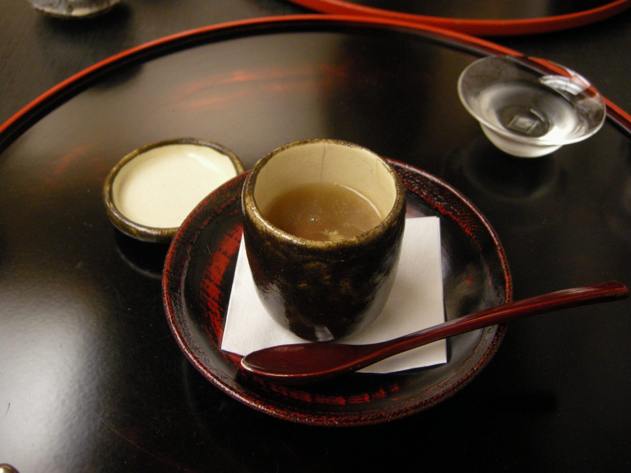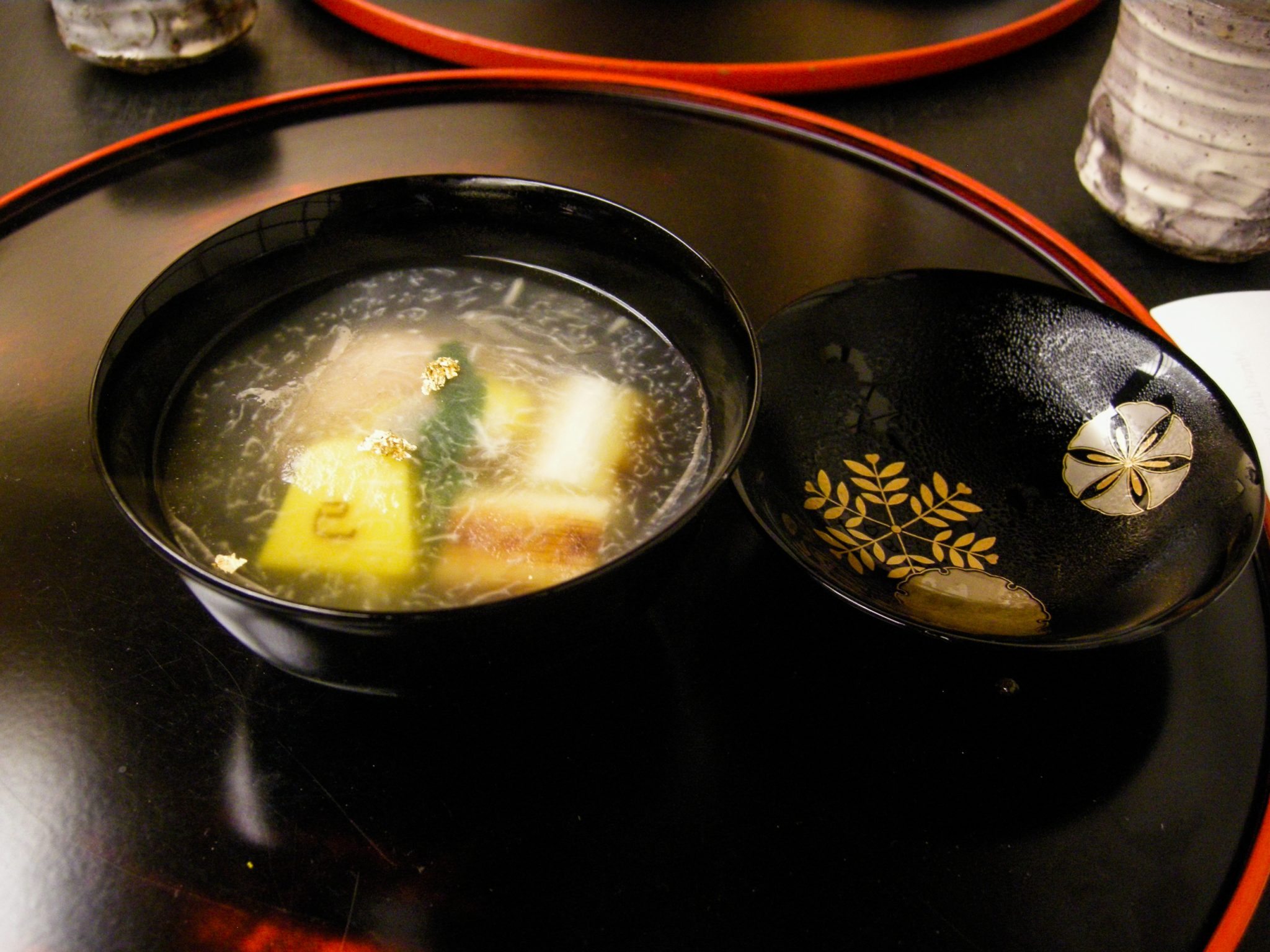 Minced turtle, yomogi dumpling, carrot slice and gold leaf. Has a rich taste.