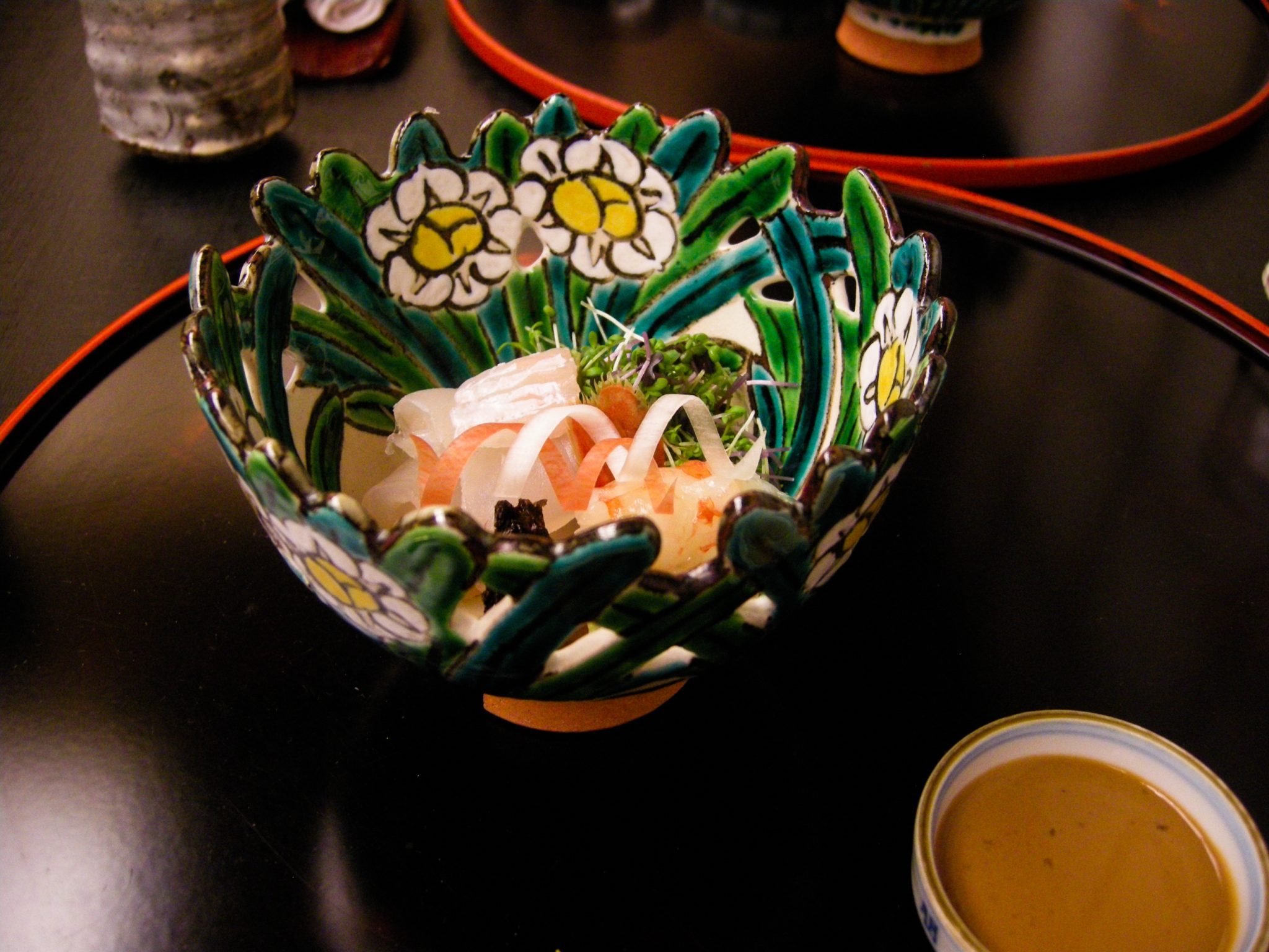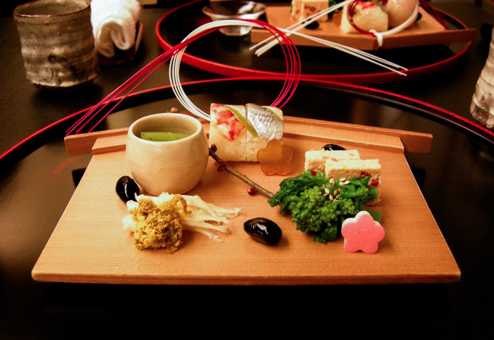 orse reins sushimi, ume, whitebait with yuzu, tofu marinated in ume, fuki, rapini, cod roe terrine, wasabi flowers. Looks good, tastes better.