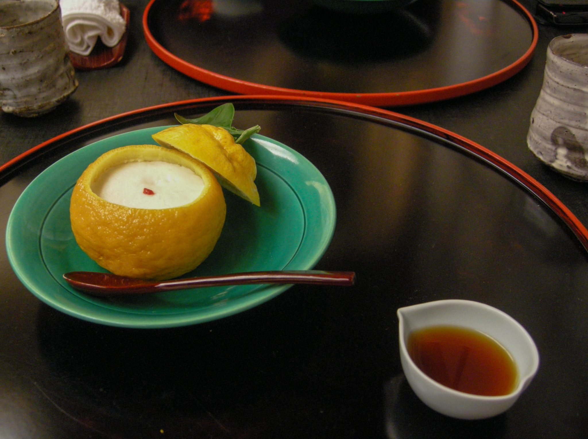 Steamed cod milt custard with Sanpokan and pozu soya sauce. Tangy and smooth.