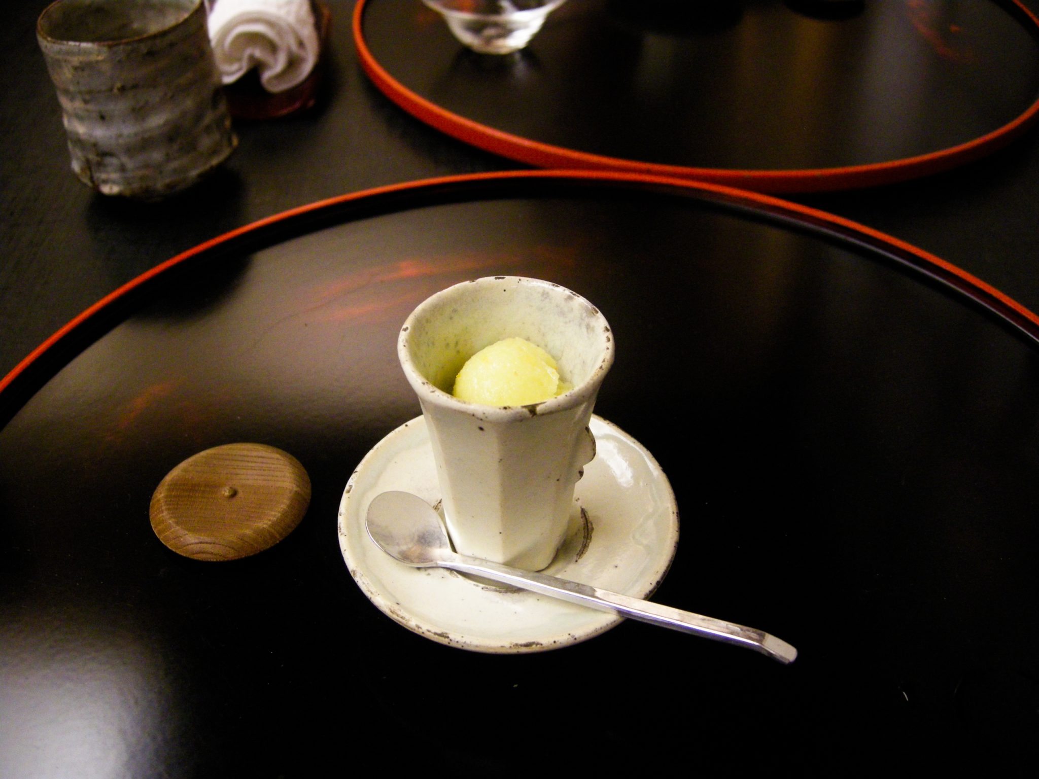 Wasabi and kumquat sorbet. Gives a sharp kick.