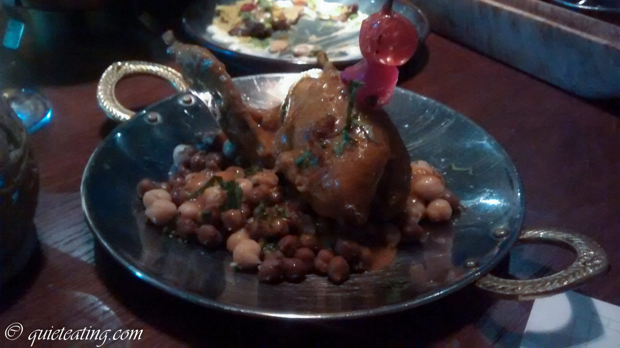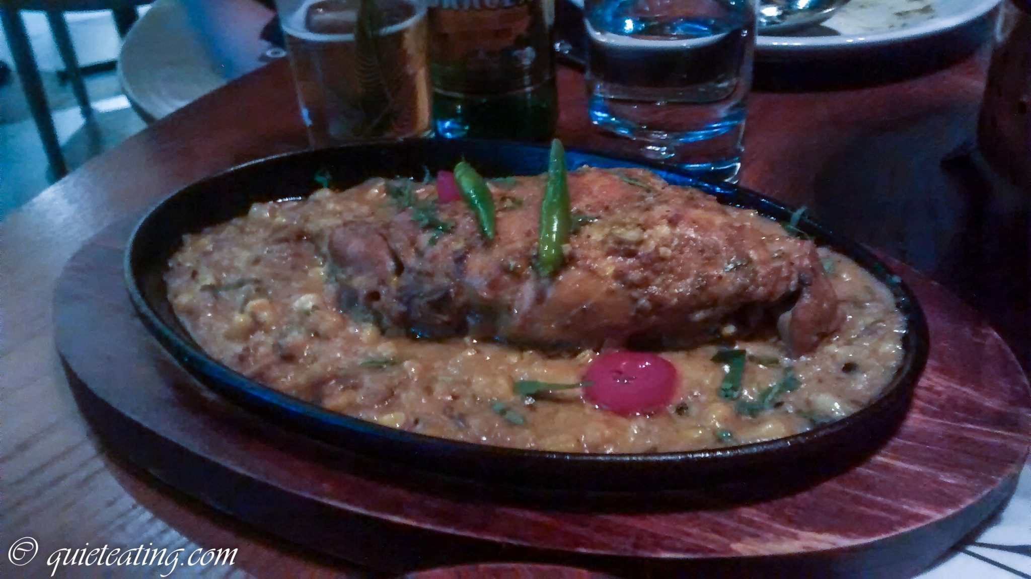 As we were in a large group too, we managed to try quite a few of the dishes following the doctrine that sharing is caring. The menu contains a fair number of classic Indian dishes but also features more Westernised dishes with some Indian flavours e.g. a hunters jungle spiced chilli beef burger and a Goan spiced haddock with mushy peas and chips. In keeping with the modern Indian restaurant trend, more forward looking ingredients were also included such game meats of quail and rabbit.