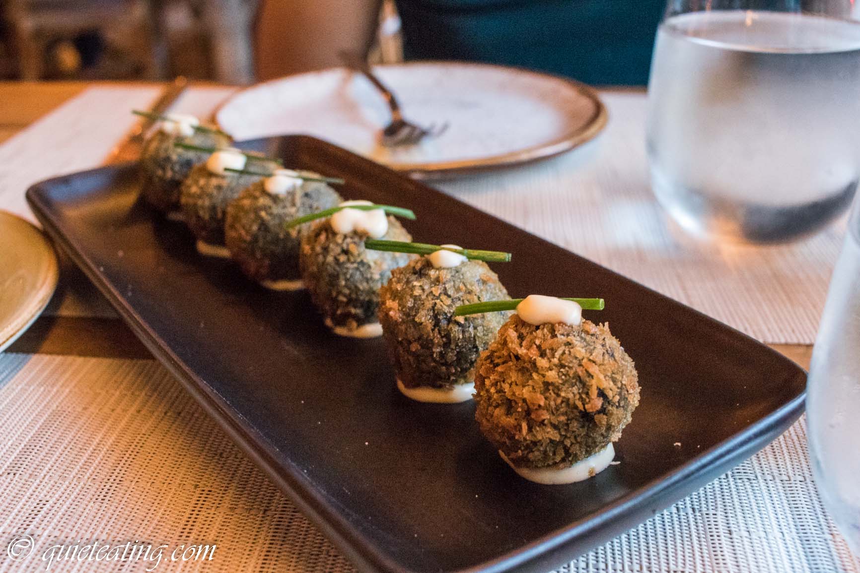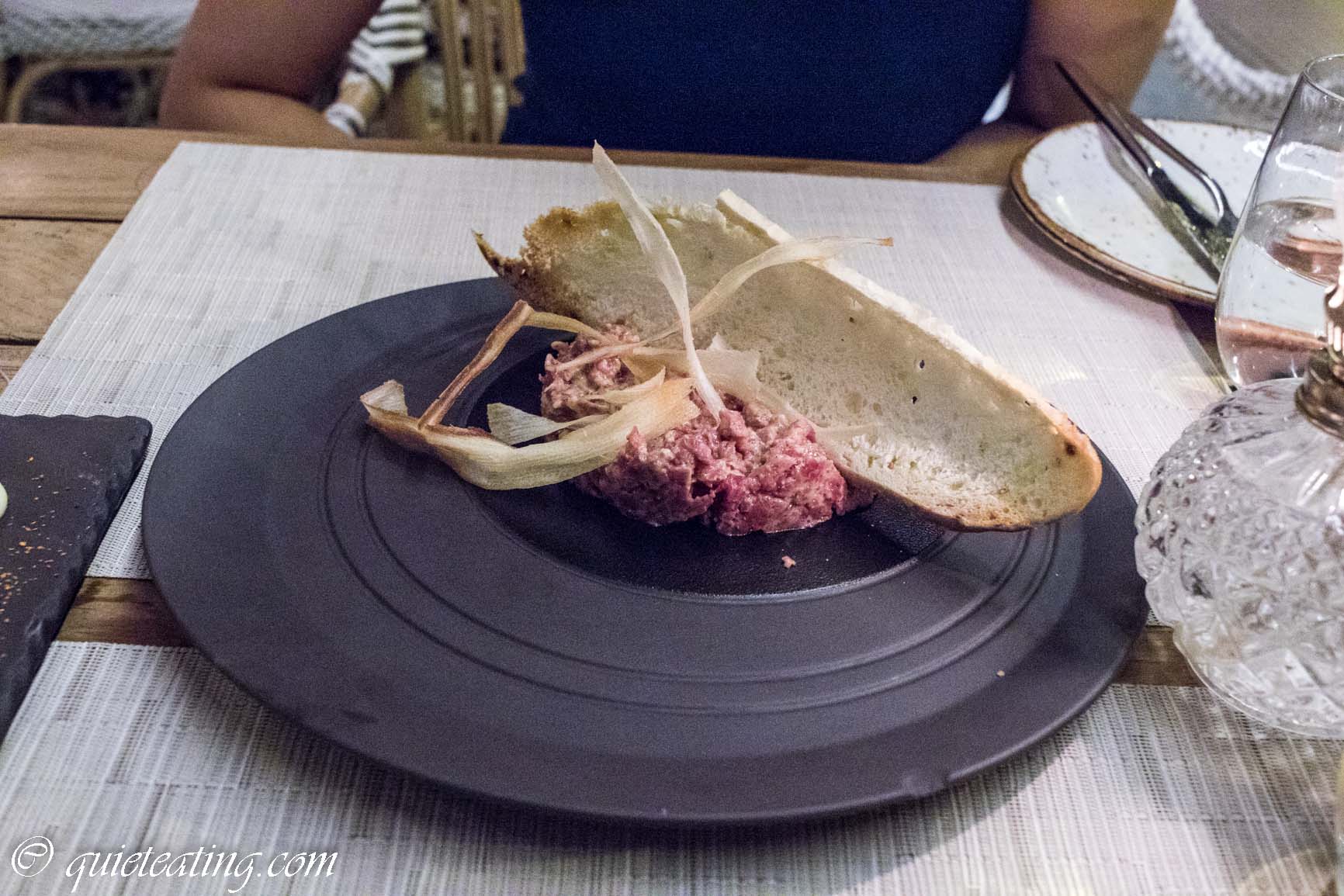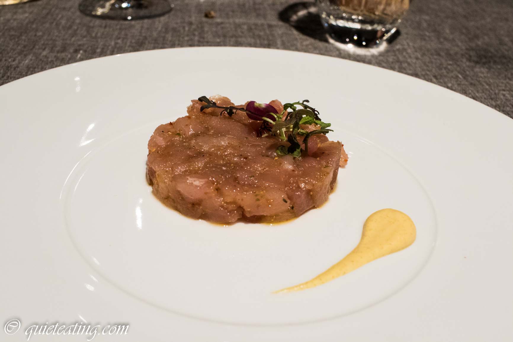 Red tuna tartar, fried quail eggs and Shrirachia mayonnaise