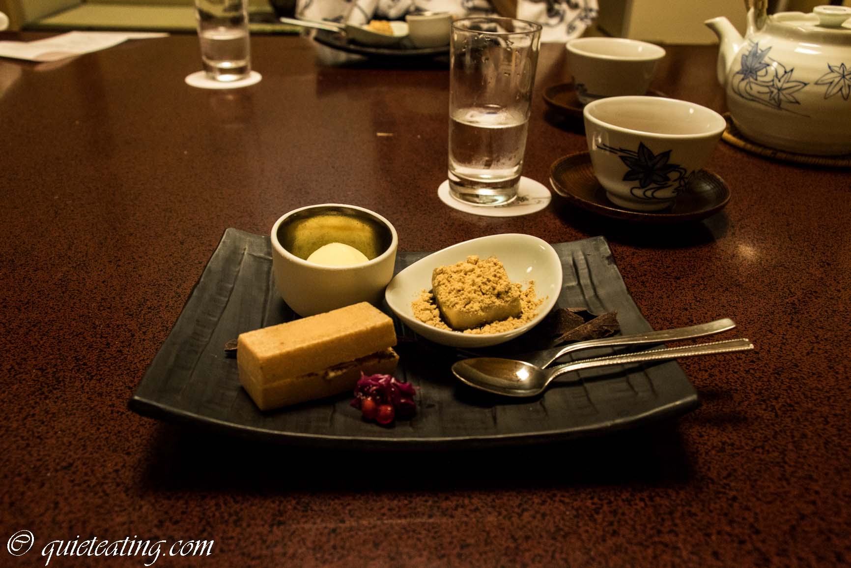 Dessert. Unfortuantely I ate the rice too fast to get a photo, sorry about that. Sesame tofu, tiramisu and citron sorbet to end