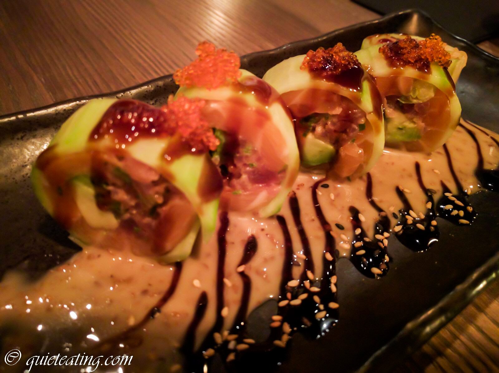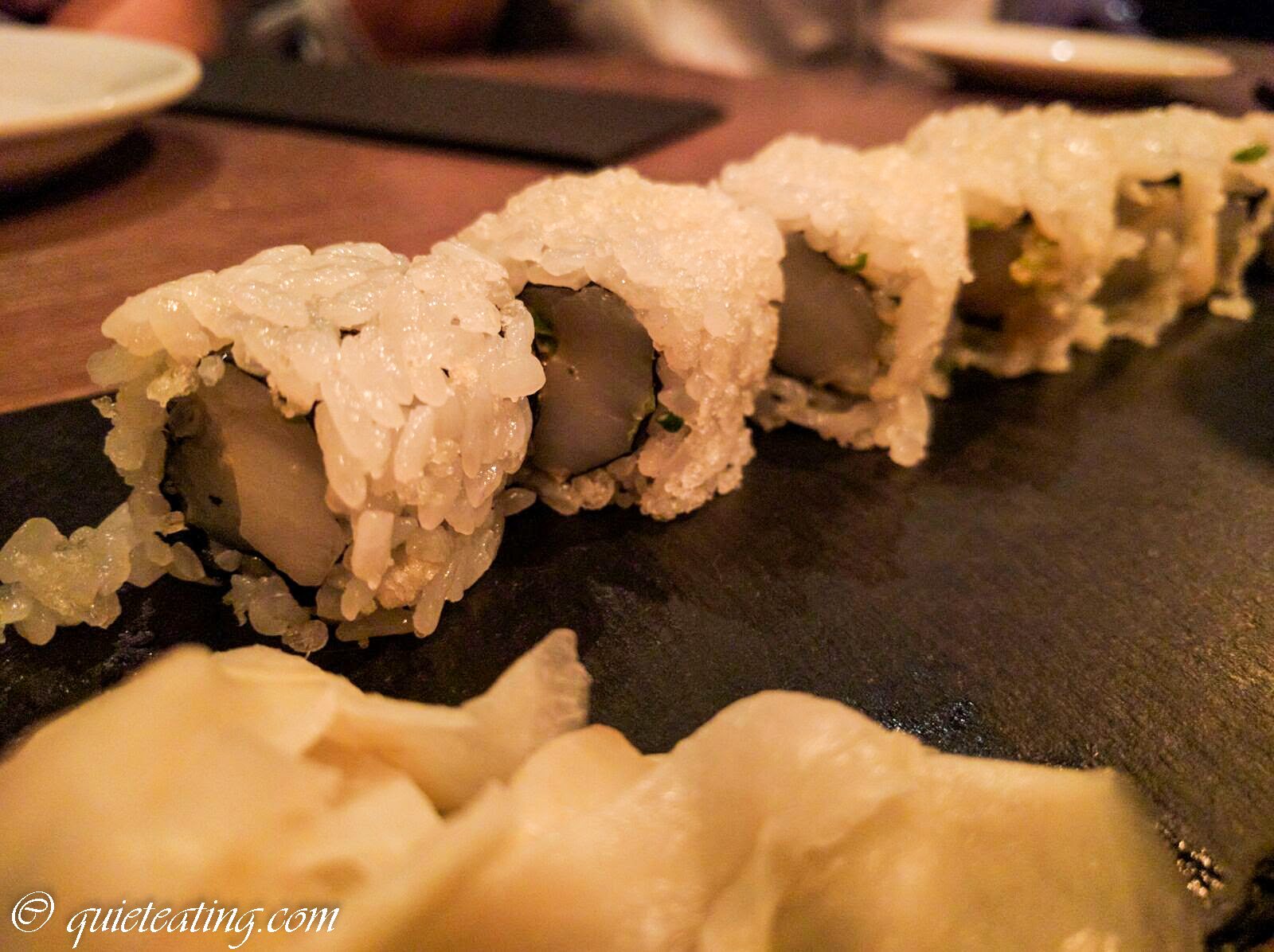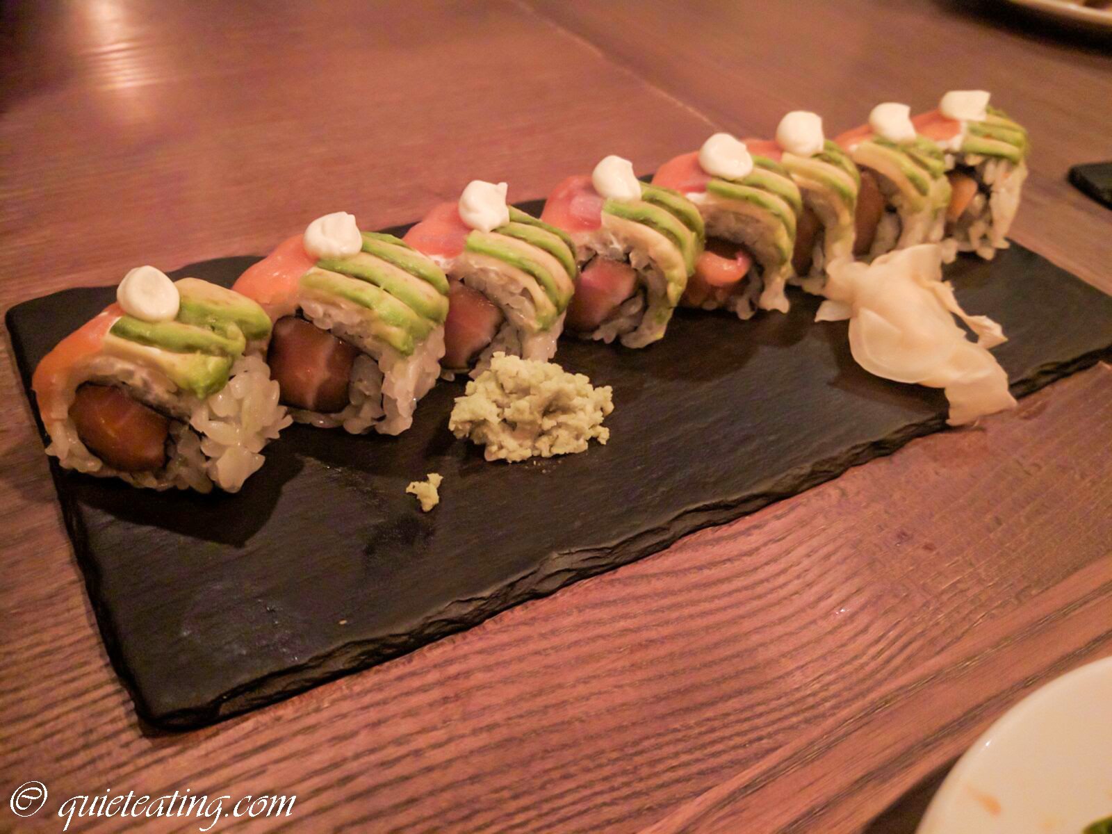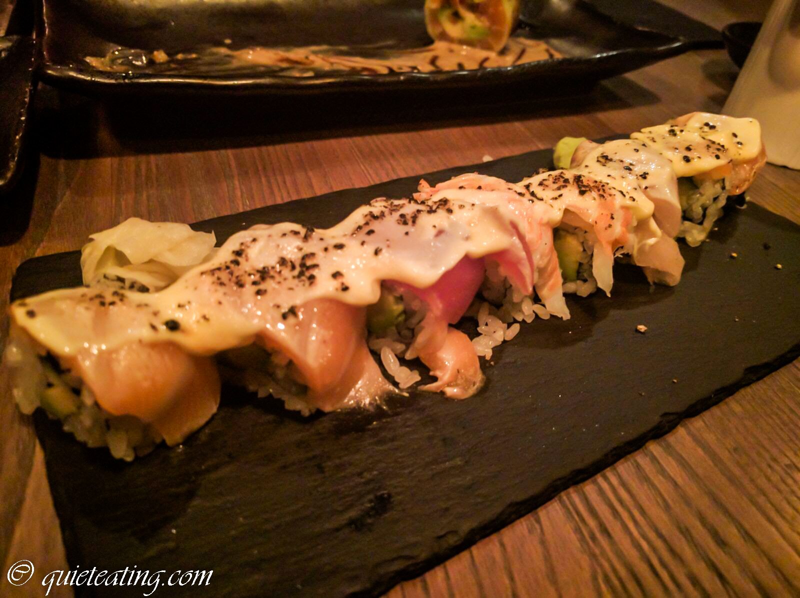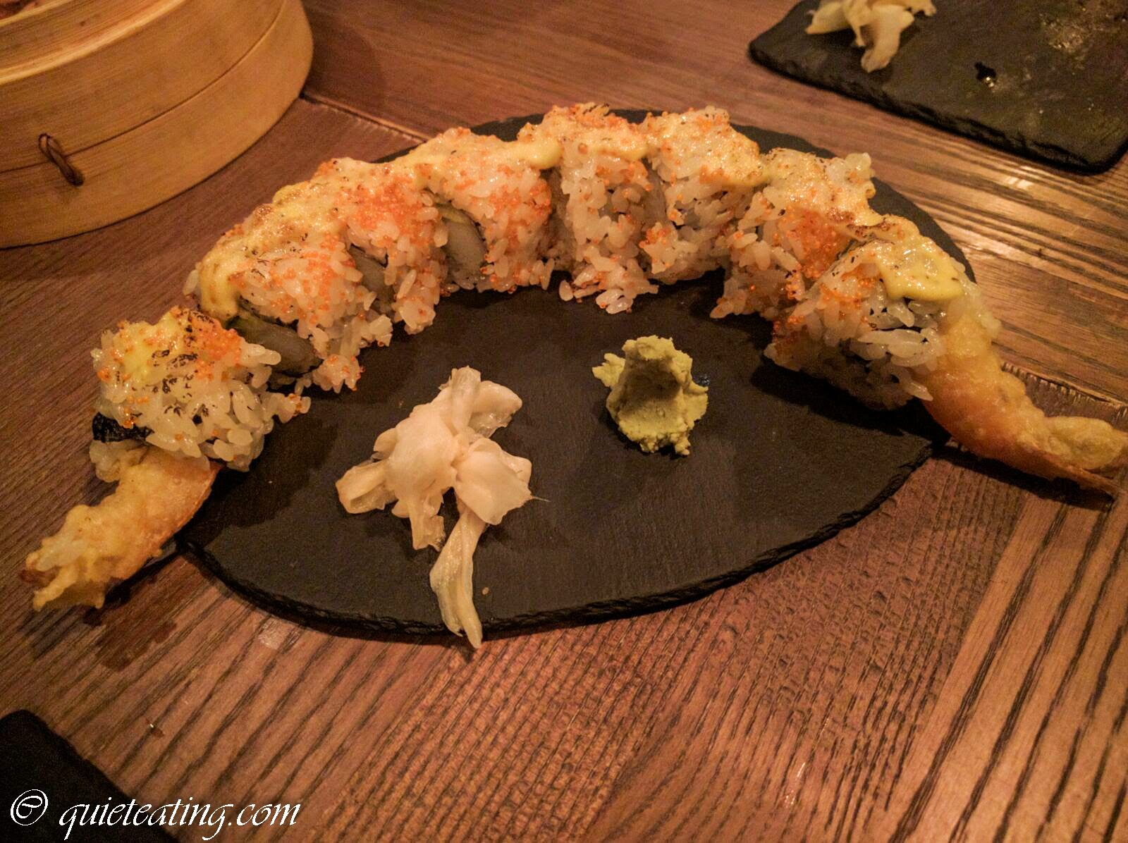 Somewhat sadly, the food did not quite match up to the ambience. The menu is straightforward – with a large selection of sushi rolls and items from a robata grill. There was also a somewhat eclectic mixture of starters and hot dishes – mostly Japanese sounding, although there were Chinese and Thai items on the menu too – so. My suspicions were aroused.